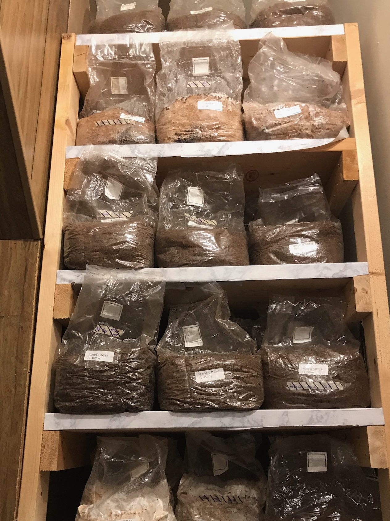 We have been madly creating spawn and substrate bags and will be hitting our full production cycle in a matter of weeks. Our goal is to be harvesting 150 bags of various mushrooms every week, and so we have been inoculating 150 every week! Our myceliation chambers are really filling up!