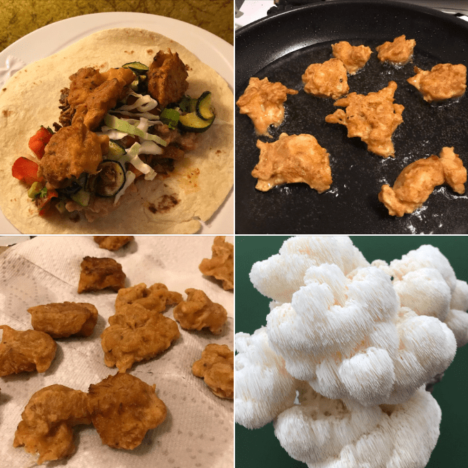 Our Lion’s Mane mushrooms are really popping! We decided to create little fritter chunks and threw a quick batter together using equal parts flour and water then some spices (we used garlic powder, onion powder, salt,pepper, smoked paprika, and cajun seasoning). We tossed our fried fritters into tacos! They were so good!