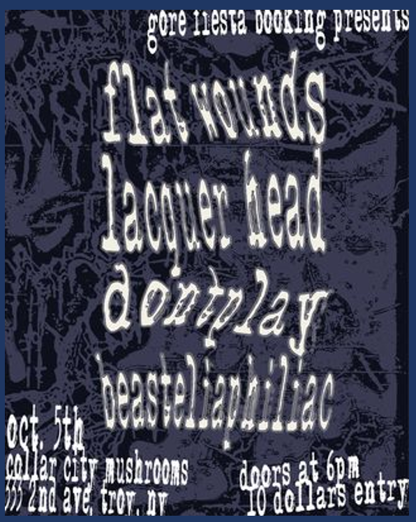 Thursday, October 5th: 5pm Metal in the Moshroom featuring Laquerhead, Don’t Play, Beasteliaphiliac, and Flatwounds.