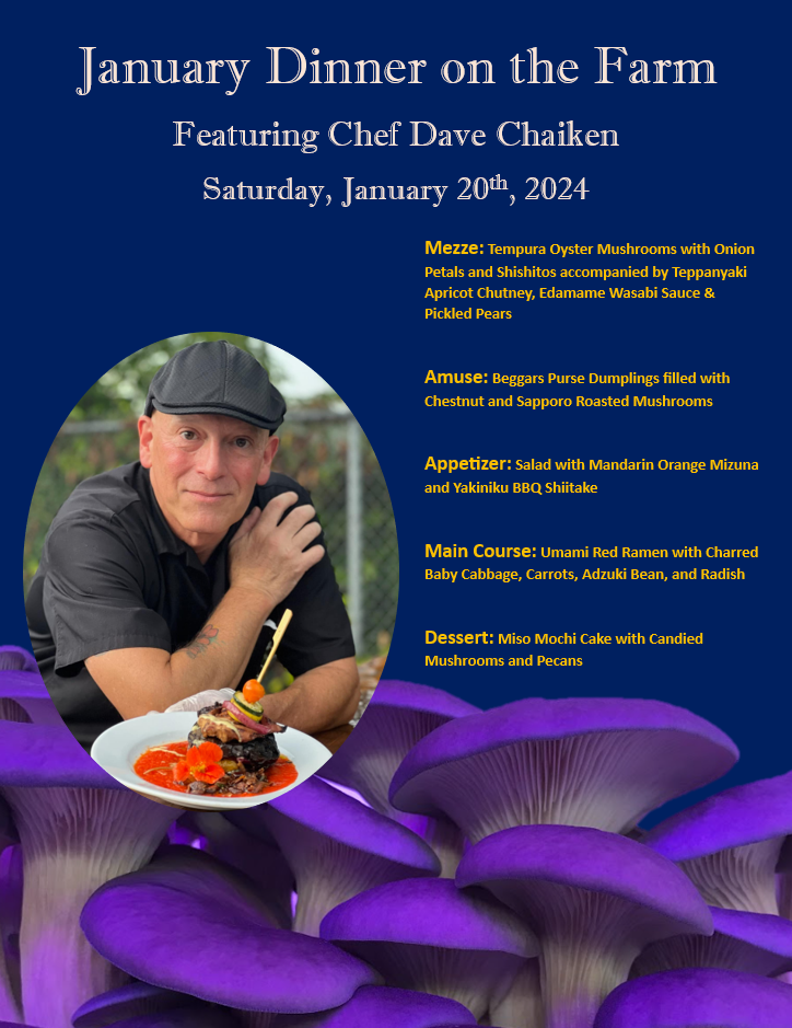 Saturday, January 20th: 5:30pm, January Dinner on the Farm by Chef Dave Chaiken $75 per seat. Buy tickets right at our farm store or through eventbrite (with extra fees)
