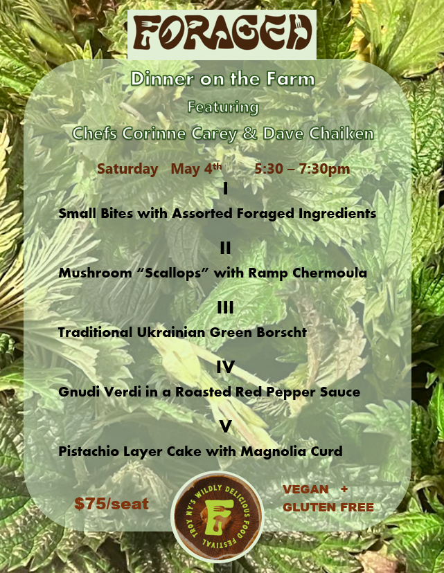 Foraged Dinner on the Farm featuring chefs Corinne Carey and Dave Chaiken. Saturday, May 4. A wild harvested unique dining experience! $75/seat. Tickets available at our Farm store or through eventbrite with a fee.