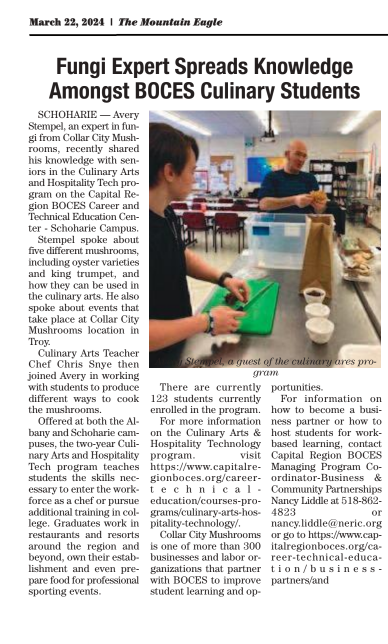 The Mountain Eagle published an article about our visit to the Schoharie Boces program: