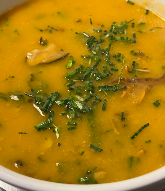 Add the Mushrooms and Greens to the blended Soup Base. Add Salt and Pepper to taste. Garnish with chopped onion grass.