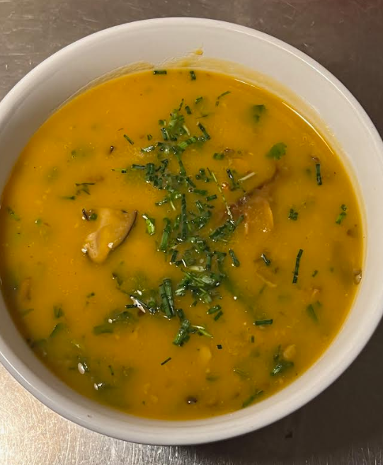 Creamy Sweet Potato Magnolia Soup with Mixed Mushrooms and Wild Greens.