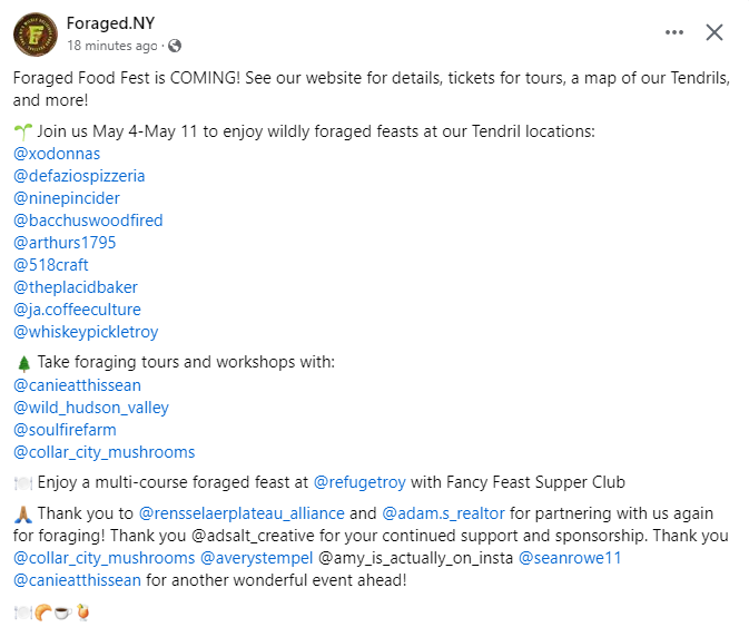Foraged New York. A Tri-city celebration of wild harvested invasives and creative culinary delights. See www.foragednewyork.org for full details.