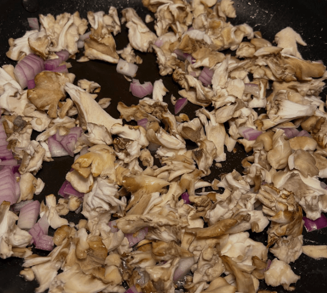 Sautee Maitake with a bit of the red onion (we always start in a dry hot pan and add a dash of salt and a splash of water, cooking for 5 minutes or so, then add oil and onions and sauteeing until onions are transparent.