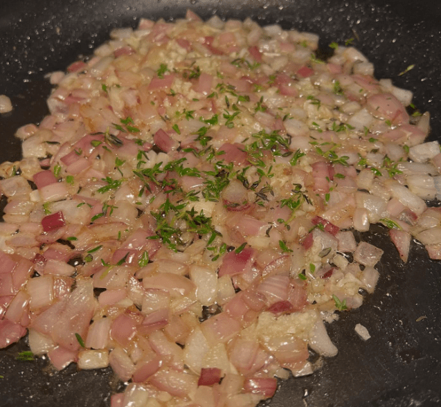 Dice Red Onion, Mince Garlic cloves, tear Maitake into bite sized chunks, slice the apple, remove thyme leaves from springs, cut firm stem bits from the Kale.