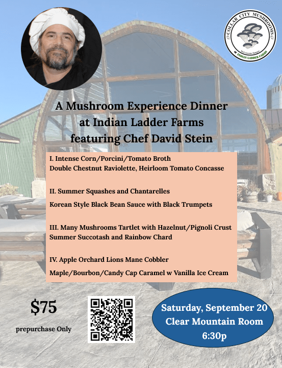 Dinner on the Farm: A Mushroom Experience featuring Chef Daivd Stein, Saturday, Sept 20 6:30 – 8:30p $75. This plant and fungi based dinner will be served at Indian Ladder Farms. Buy your tickets Now!