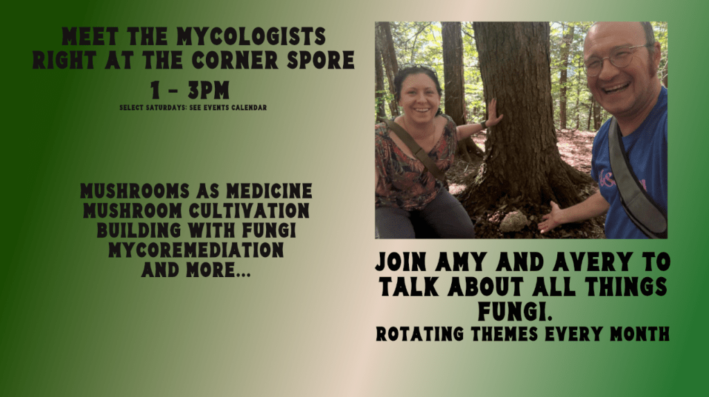 Once a month you can join Amy and Avery at the Corner Spore from 1 – 3pm for a social mushroom hang! Check out our calendar for dates.