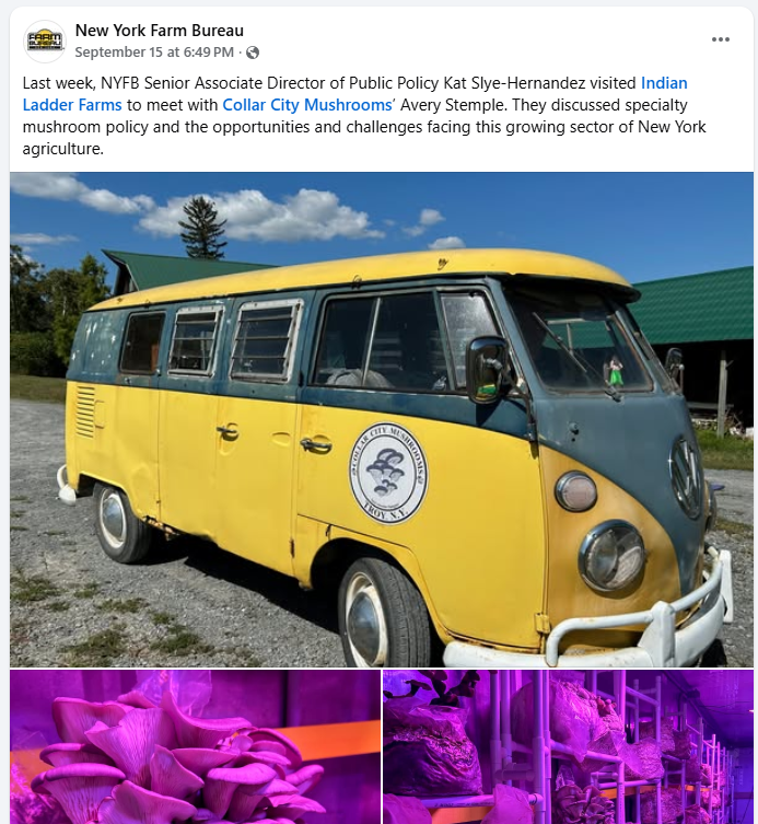 New York Farm Bureau Public Policy Director Kat Slye-Hernandez visited to brainstorm mushroom farming specific policies to create a section of Farm Bureau Policy dedicated to fungi production.