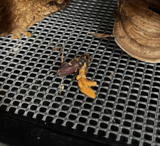 While camping in the Adirondacks Amy discovered a fully intact Cordyceps militaris growing from its beetle host! We delicately pulled it apart and dried it for educational purposes!