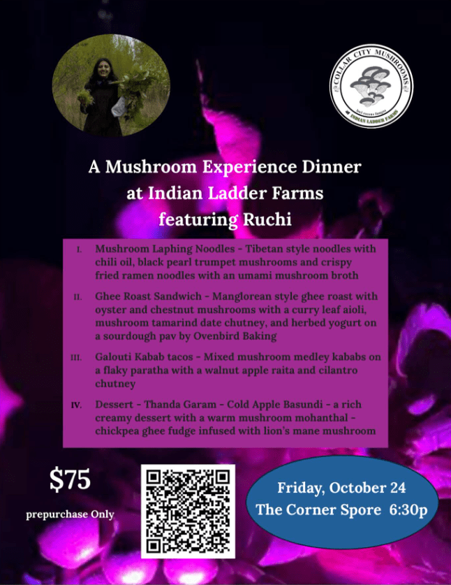 Mushroom Experience Dinner Featuring Ruchi. Friday, October 24th, 6:30 – 8:30pm. Served in the Corner Spore at the Yellow Rock Cafe. Full Menu on the below flyer. Only 20 tickets are available for this Celebration of Diwali dinner by Ruchi! Vegetarian, NOT Vegan. This dinner will include dairy.