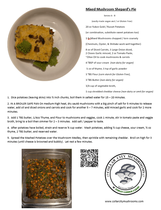 November is a great month to fire up the oven and lay out some piping hot, meaty meals! We revisited one of our absolute favorites: a mixed mushroom shepard’s pie. Give it a try at home! We used a small sweet potato in the mix this time around and all the mushrooms came from our compost pile harvest (Nameko, Chestnuts, and Oysters).