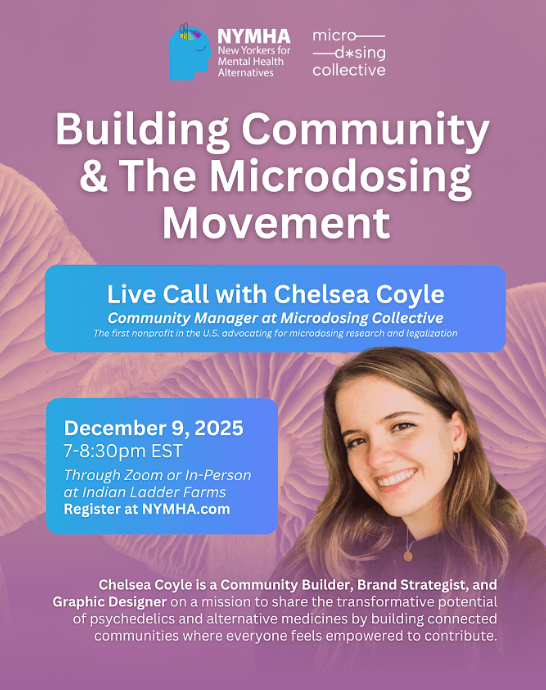 New Yorkers for Mental Health Alternatives Monthly Meeting, Tuesday, December 09th 7pm – 8:30pm. This monthly meeting will feature Chelsea Coyle, Community Manager at Microdosing Collective. We’ll hear her talk about microdosing and community building as well as the upcoming fundraising dinner with the Microdosing Collective and steps we’ll be taking next year. The meeting will be in person at Indian Ladder Farms in the Yellow Rock Cafe or online via zoom from anywhere. THIS WILL BE THE LAST IN PERSON MEETING UNTIL MARCH 2026.