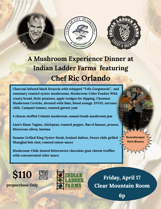 Mushroom Experience Dinner Featuring Chef Ric Orlando, Friday, April 17th, 6pm – 8pm. Tickets on sale starting March 18th. Dinner will be served in the Clear Mountain Room at Indian Ladder Farms. See EVENTBRITE for details.