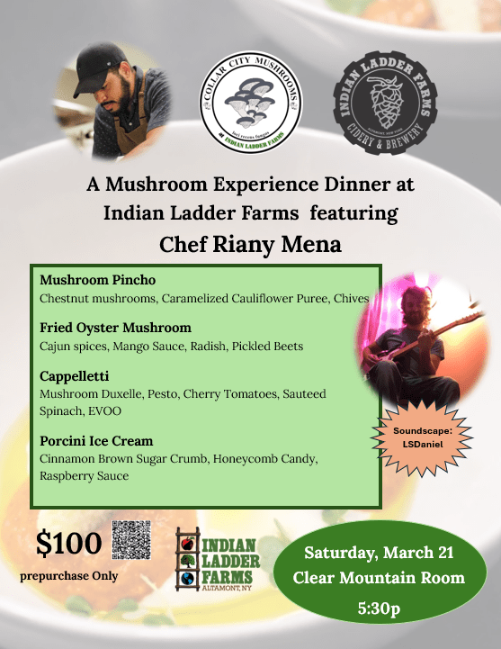 Mushroom Experience Dinner Featuring Chef Riany Mena, Saturday, March 21st, 5:30pm – 7:30pm. Tickets are now on sale (and disappearing fast). Dinner will be served in the Clear Mountain Room at Indian Ladder Farms. See EVENTBRITE for details