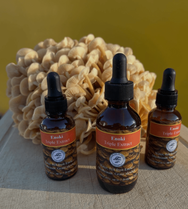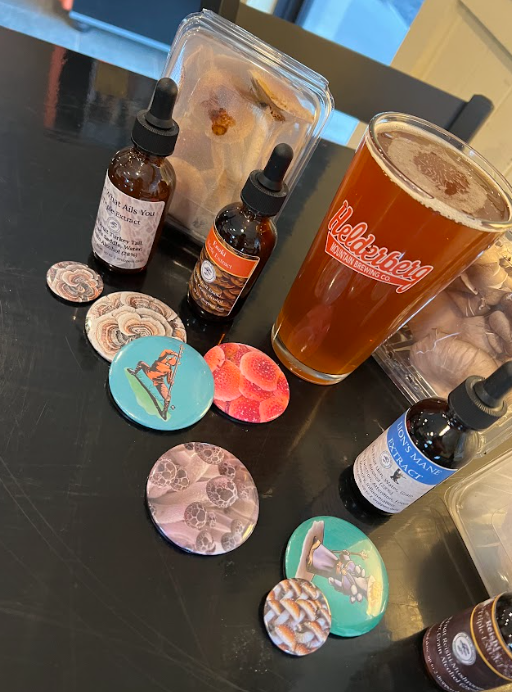 We introduced several new products this month. Our enoki extracts hit the shelves (details in March’s newsletter). We made a new enoki nettle tea. And LH Buttons produced some amazing buttons and magnets for us! Available in the Corner Spore as well as at our market vending locations.
