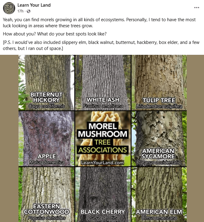 Many people ask us about finding morels. With the season of these elusive curious mushrooms approaching, we would love to share Adam Harington’s Lear your Land site. Here’s his page dedicated specifically to morels, including a video on understanding the environments where morels often thrive. He posted a fantastic collage of tree photos that often grow relationships with morels. Want to know morels? Learn your trees!