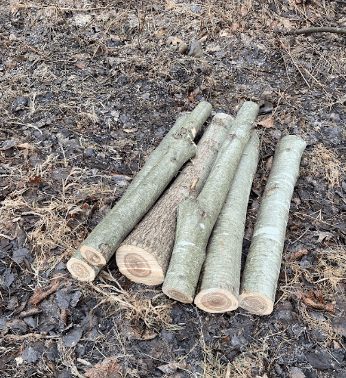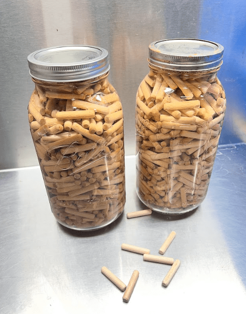 Spring is logs and dowel time! We do make dowel spawn by request, it is not something we consistently carry, but for customers who want to support local businesses and have planned ahead, it is very easy for us to sterilize and inoculate wooden dowels for log use. We can always supply sawdust spawn for the strains we grow. Brian from Rudy Stempel’s family Sawmill in East Berne cut a few hophorn beam trees and oak trees for our own mushroom growing purposes. After they’ve “rested” for a couple weeks we’ll be inoculating them with Shiitake, Chicken of the Woods, and Brick Cap spawn.