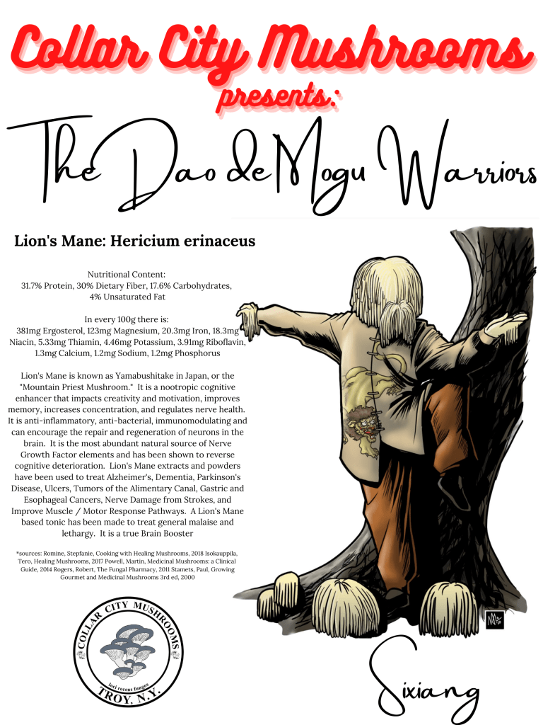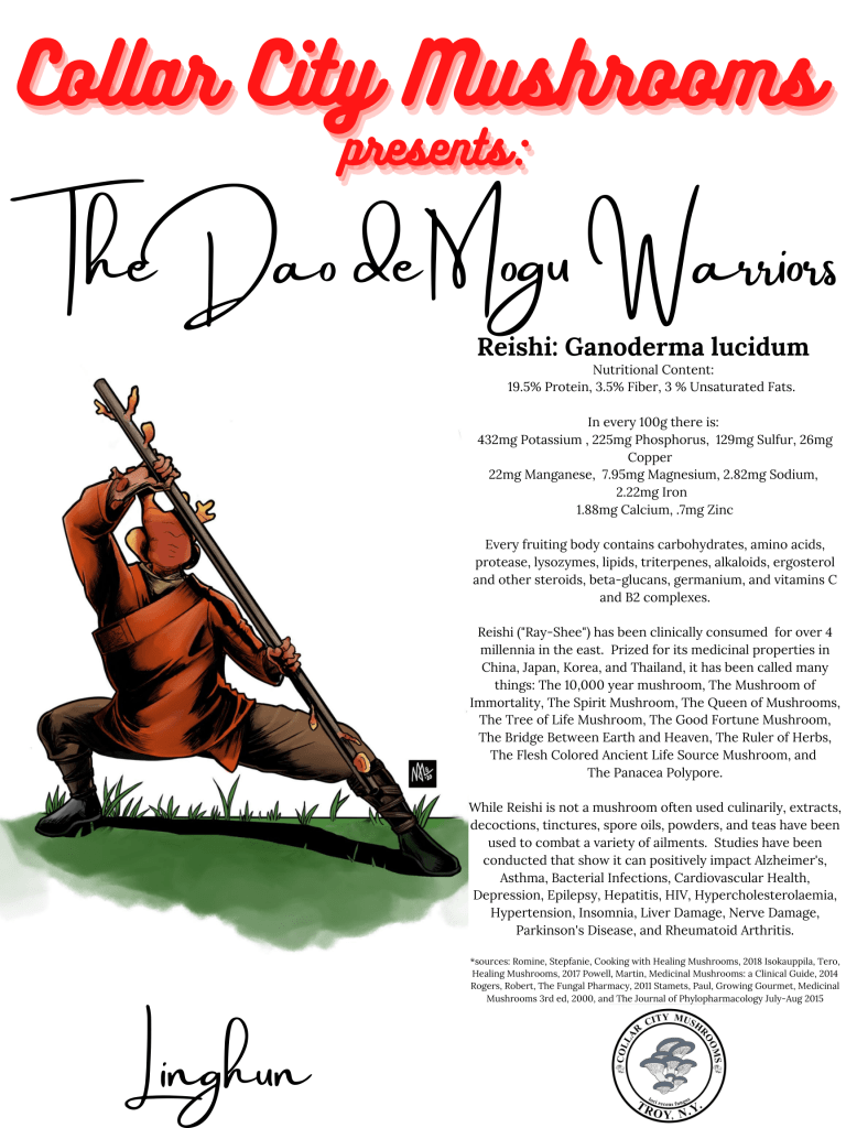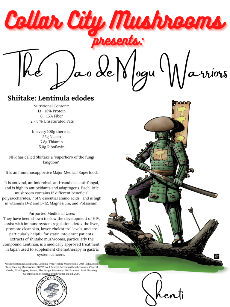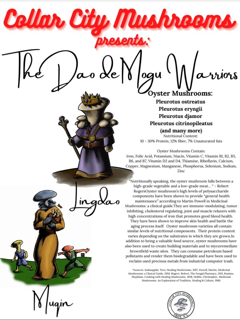 From whence do ideas spring? How does inspiration work? Which parts of two creative forces working on the same substrate are random and which intentional?! When Avery first decided to launch Collar City Mushrooms as a company he sought to bring together many of his creative friends to collaborate on a coloring book to reward donors to our GoFundMe campaign and then to be available as a sellable product once the brick and mortar retail space opened up. One of those creatives happened to be Mike Lake of Lake_Graphics. Meanwhile, attempting to come up with a unique and catchy way to showcase the mushrooms and their purported benefits had been percolating. When Mike provided his submission for the coloring book sparks flew, and the idea fully brewed. By creating a series of warrior characters we could grab people’s attention and provide quickly digestible facts about what they are capable of. The Dao de Mogu (The Way of the Mushroom) was born. So far we have the art for 7 characters based on the mushrooms that we are growing. There are already two card based games in creation and at least a 4 issue comic series taking place in Myconation featuring these Mushroom Warriors and the other fungi they encounter.