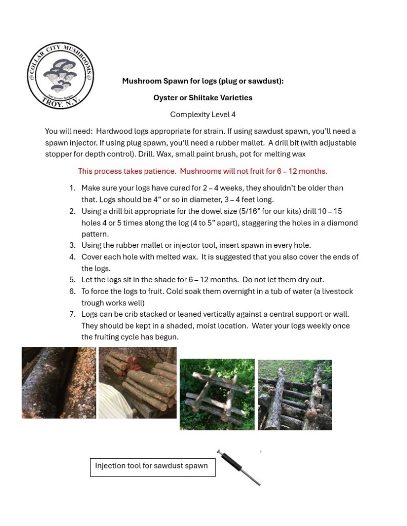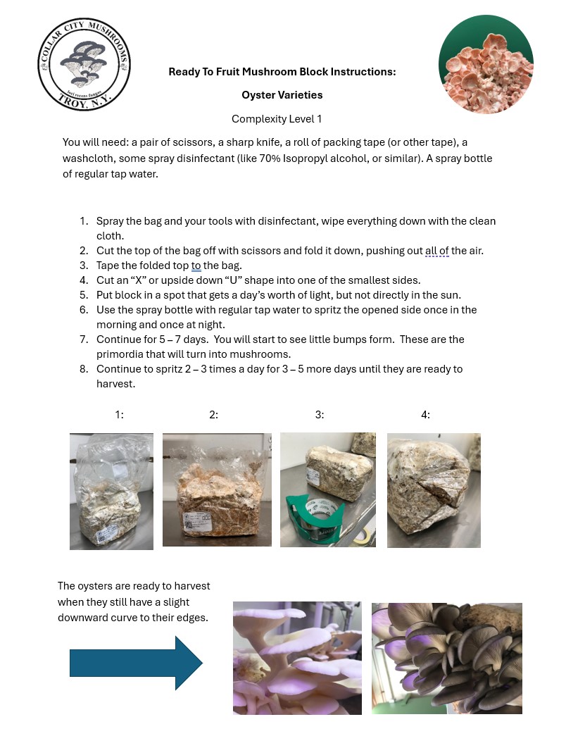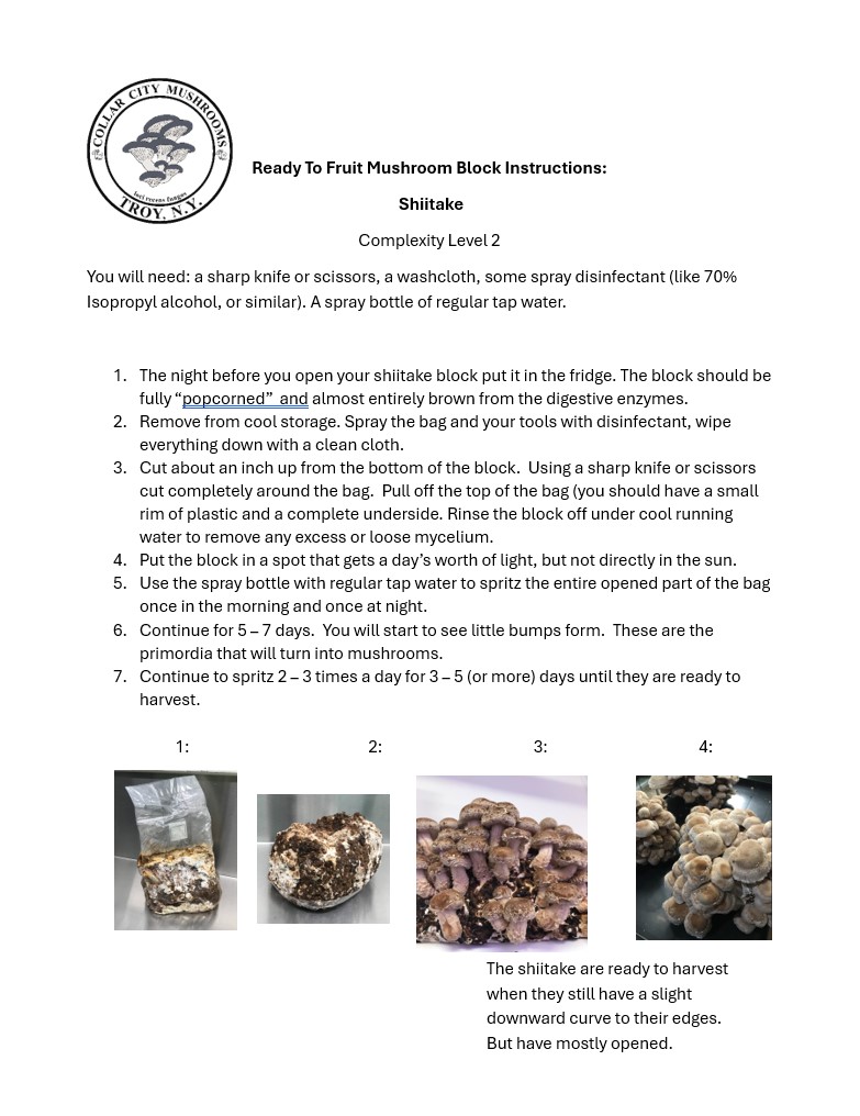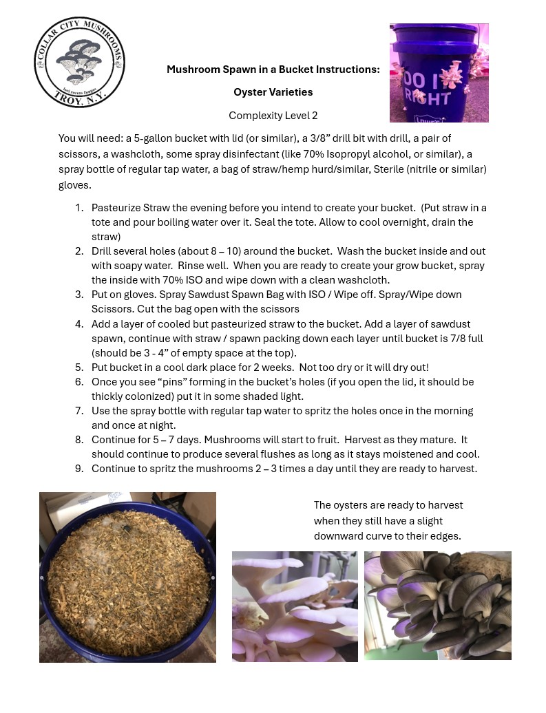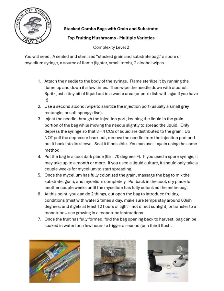 Below are instructions sheets that accompany our workshops. These sheets are reminders and brief introductions. If this is your first attempt at growing mushrooms at home there are a myriad of good YouTube videos, books, and websites that will give you additional details if you cannot attend one of our workshops.